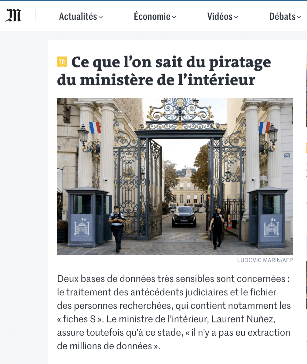 Un article de presse dont l’intitulé est « Ce que l’on sait du piratage du ministère de l’Intérieur », accompagné d’une photo de l’entrée du ministère avec une voiture passant le portail.