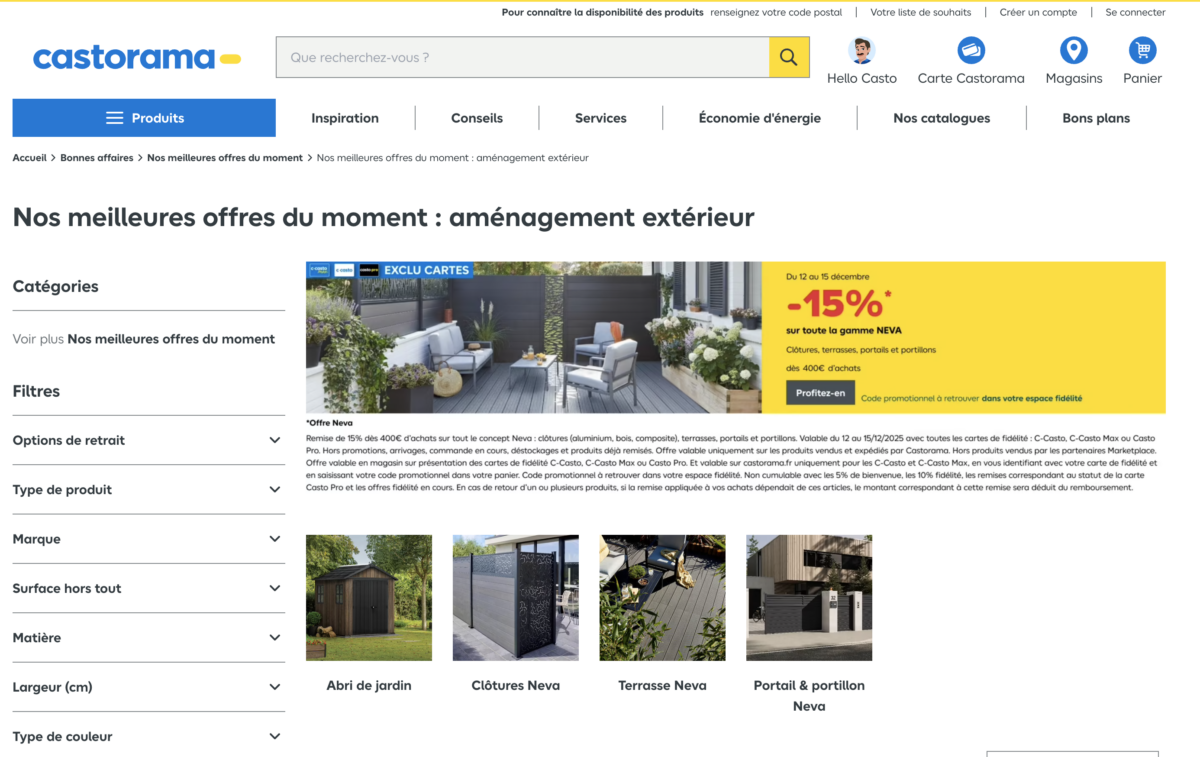 Une offre commerciale affichée sous forme d’image : « –15 % sur toute la gamme NEVA », avec conditions et informations intégrées dans le visuel (exclusivité cartes et restrictions diverses).